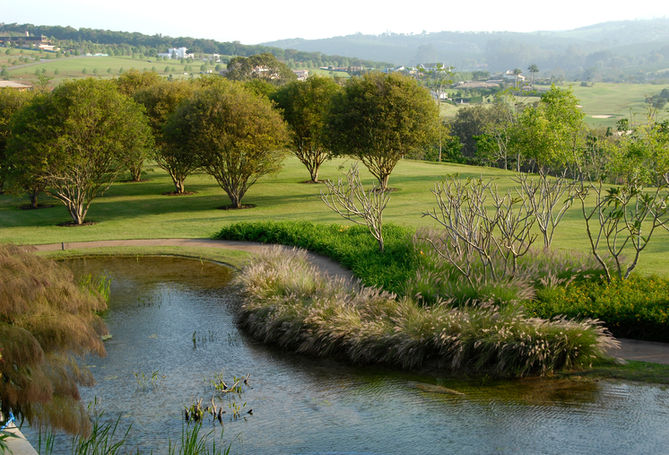 Era um terreno com dimensões generosas em um condomínio em Bragança que iria abrigar uma casa de fim de semana para uma família paulista. O terreno de mais de 30.000 m² ocupava uma quadra e era todo coberto de grama batatais. Nenhuma árvore. Circundado de ruas por todos os lados, com um desnível de doze metros, não tinha vizinhos muito próximos, mas muitos estavam por vir. Havia um programa extenso que o projeto de paisagismo deveria contemplar, o que não seria uma dificuldade dado o tamanho do lote. O elemento que seria o ponto focal de todo o projeto, a ser criado pelo projeto de paisagismo a pedido do cliente, seria um lago com peixes e água cristalina, em que se pudesse entrar, nadar e observar um mundo aquático inspirado nos lagos de Bonito, em Mato Grosso do Sul.